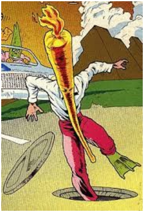 A mysterious man suffered brain damage after reading 5,000 comic books in one sitting on a bet, and then resurfaced as The Flaming Carrot. The Flaming Carrot’s outfit consists of a massive carrot mask with a flame above the head.