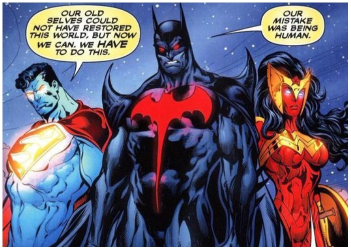 The Trinity has been replaced by villains in the new world, and Batman, Superman, and Wonder Woman have never been. Instead, the group was transported to another world, where they were transformed into gods. Batman was Atmahn the Night Judge in the new reality, and he was worshiped by the primitive beings of the planet.