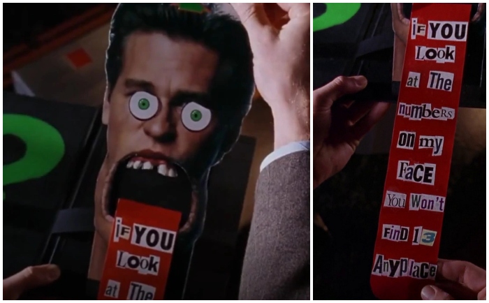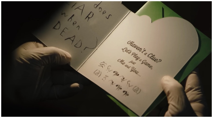 The riddle left with the first body in the movie has become iconic. “What does a liar do when he is dead?” Many viewers solved this one after the riddle was shown in the trailer, “he lies still.”