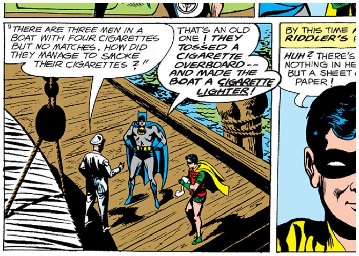 It is one of the classic takes of the Riddler, with the Dynamic Duo giving him a run for his money. The answer for the riddle, “they tossed a cigarette overboard and made the boar a cigarette lighter,” cements the theory of it being a wordplay.