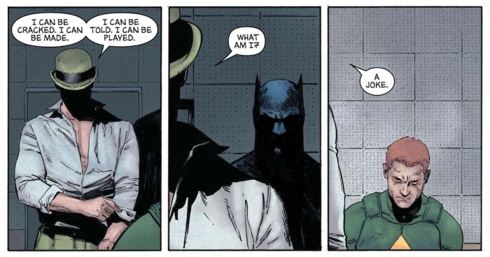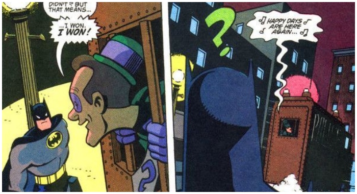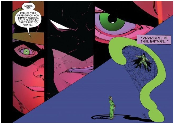 There is an interview scene with the Riddler. He uses a series of riddles to narrate past events, his relationships with other city figures, and his motivations. One of the most famous riddles from this comic is by Riddler, “when is a door not a door?”