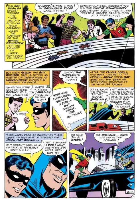 The riddle in this issue, “what occurs once in every minute, twice in a moment, but never in a thousand years?” caused Robin to admit defeat. But Batman solved it, “the letter M,” saying that it is one of the simpler riddles by the Riddler.