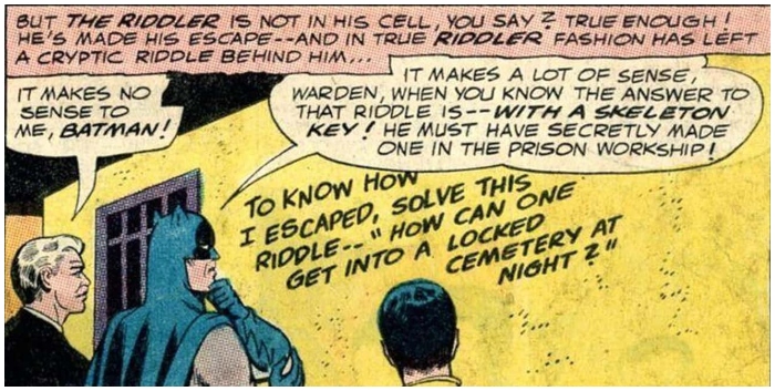This classic riddle, “how can one get into a locked cemetery at night?” was presented in the Batman No.179 issue in 1966. The Riddler breaks free from prison before getting into this cat-and-mouse game with the Caped Crusader. Batman again showed off his skills by solving the riddle “with a skeleton key.”