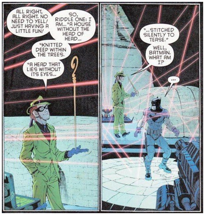 But this riddle in Batman No.33 is considered among the most complex ones even hardcore Riddler fans had trouble solving. “I am a house without the head of the head, knitted deep within the trees. A head that lies without its eyes stitched silently to tears. What am I?” Batman was faced with this during the Zero Year challenge. He managed to solve it in true Batman fashion, “a louse.”