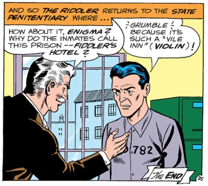 In the 1965 Batman No.171, Commissioner Gordon jokingly presents a riddle for the green-suited criminal after he is caught, “why do the inmates call this prison– Fiddler’s Inn?” The Riddler admits his defeat and answers deadpan, “because it’s such a vile inn (violin).”