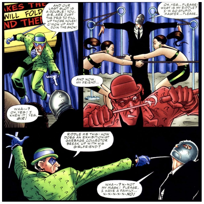 In a rather sadistic move, the Riddler presents a man with the riddle, “how does an exhibitionist garbage collector break up with his girlfriend?” The man had a knife held to his neck by the Riddler as he solved it, “he dumps her in public.”