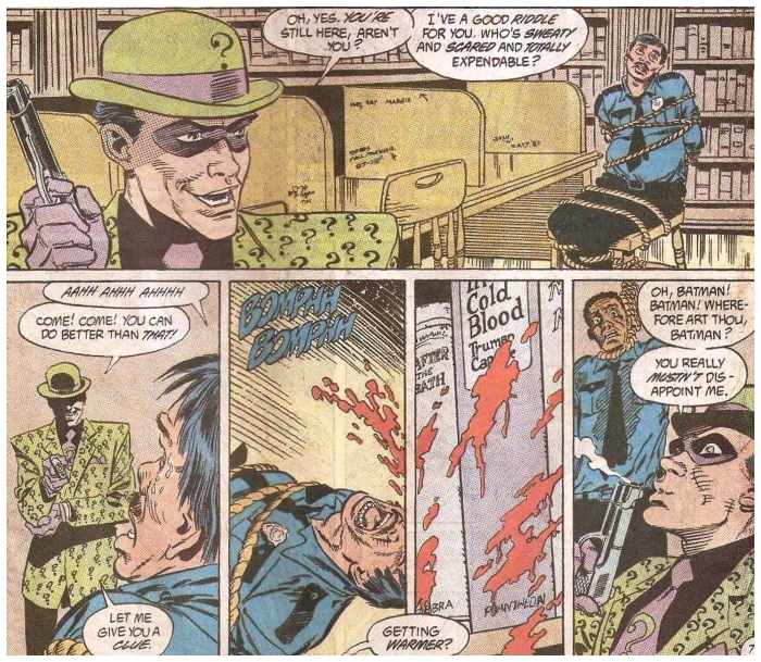 The Riddler has an officer restrained to whom he poses a riddle, “who’s sweaty and scared and totally expandable?” It shows the more twisted side of Riddler since he kills that officer just moments later. The answer to the riddle is “the restrained police officer.”